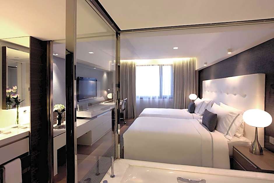 Featuring a laptop-size safe, a 40-inch LCD TV, an acoustic system and a branded coffee machine, this suite has a large bathroom attached with a double-sink, in-mirror TV, a bathtub and separate rainshower. Guests can use the complimentary pocket WiFi.